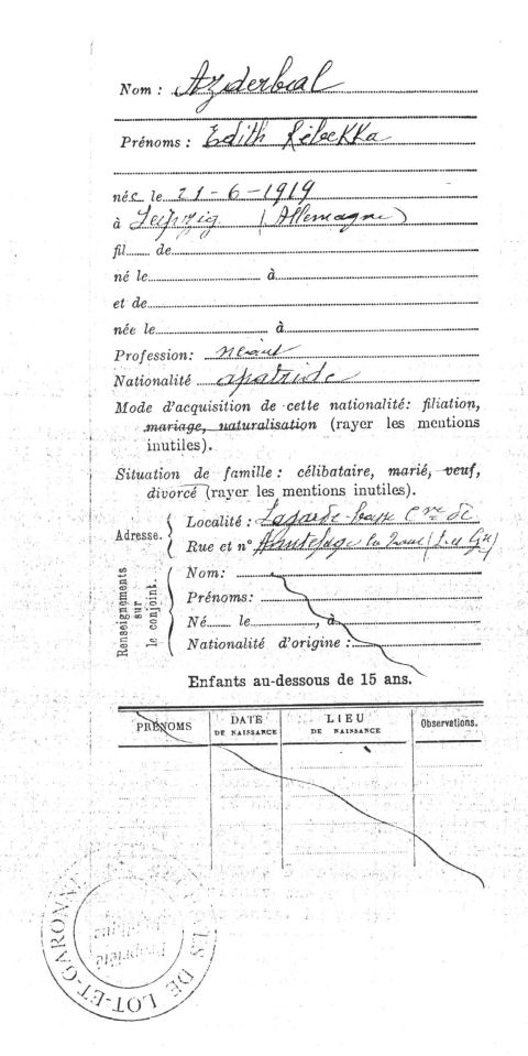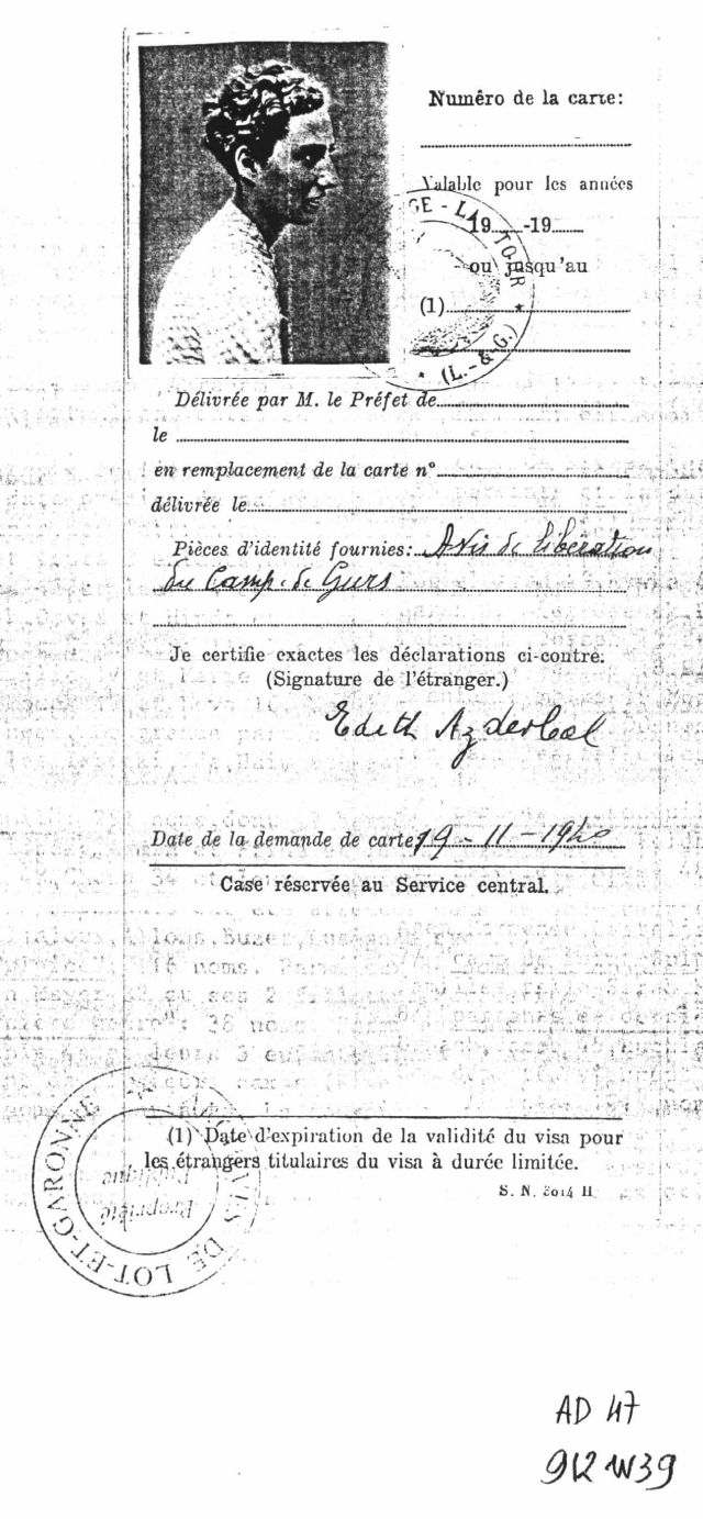 Identity card (front and back) issued to Edith Azderbal on 19 November, 1940 by the Department Lot et Garonne where Villeneuve was located. The card was issued based on proof of liberation from Camp Gurs. It shows her correct date of birth as 21 June, 1919.