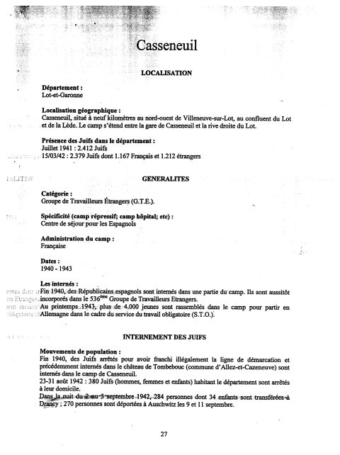 Publication that gives the details of the camp. 380 Jews arrested from August 23-31, 1942. Of these, 284 were deported on September 2-3 to Drancy, and most were then sent on September 9-11 to Auschwitz.